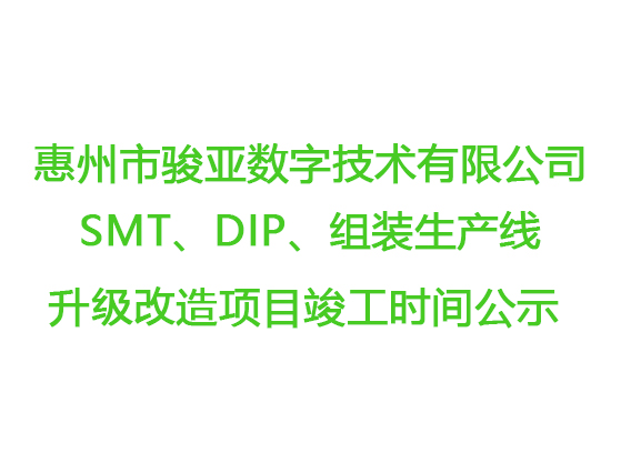 惠州市駿亞數(shù)字技術(shù)有限公司SMT、DIP、組裝生產(chǎn)線升級改造項(xiàng)目竣工時(shí)間公示